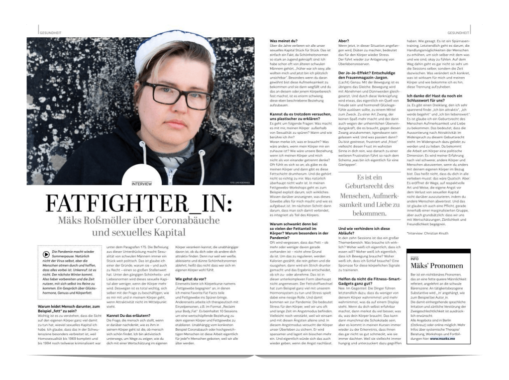 - Leo (Sept’21): „FATFIGHTER_IN – Mäks Roßmöller über Coronabäuche und sexuelles Kapital
